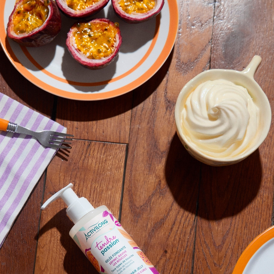 Formulée avec 99 % d'ingrédients naturels, vegan, sans alcool ajouté ni silicone, cette gelée associe le jus de fruit de la passion bio, qui hydrate et fortifie, à l'huile de passiflore, reconnue pour limiter la perte en eau et apporter de la souplesse. L'huile d'hibiscus, quant à elle, sublime et lisse les longueurs pour des boucles éclatantes et maîtrisées.