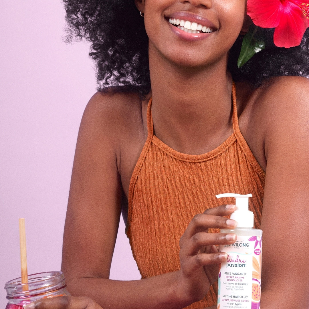La gelée fondante ACTIVILONG Tendre Passion aide à structurer les boucles et contrôler les frisottis. Elle apporte brillance et tenue légère pour un coiffage naturel.